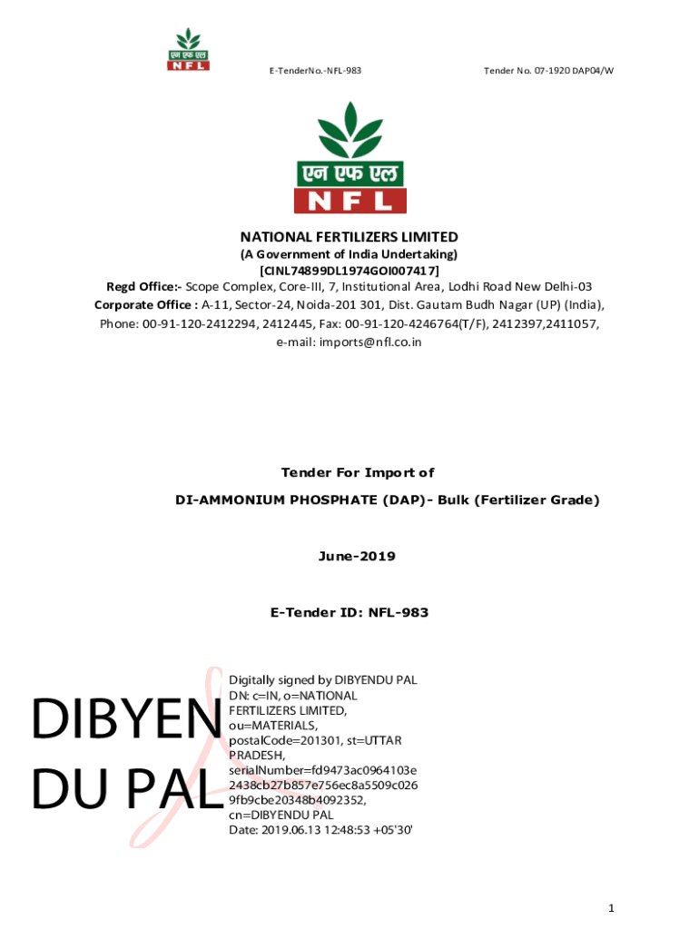 Tender.NFL983Tender No. 071920 DAP04/NATIONAL FERTILIZERS LIMITED (A Government of India Undertaking) [CINL74899DL1974GOI007417] Red Office: Scope Complex, Foreign, 7, Institutional Area, Lodi Road
