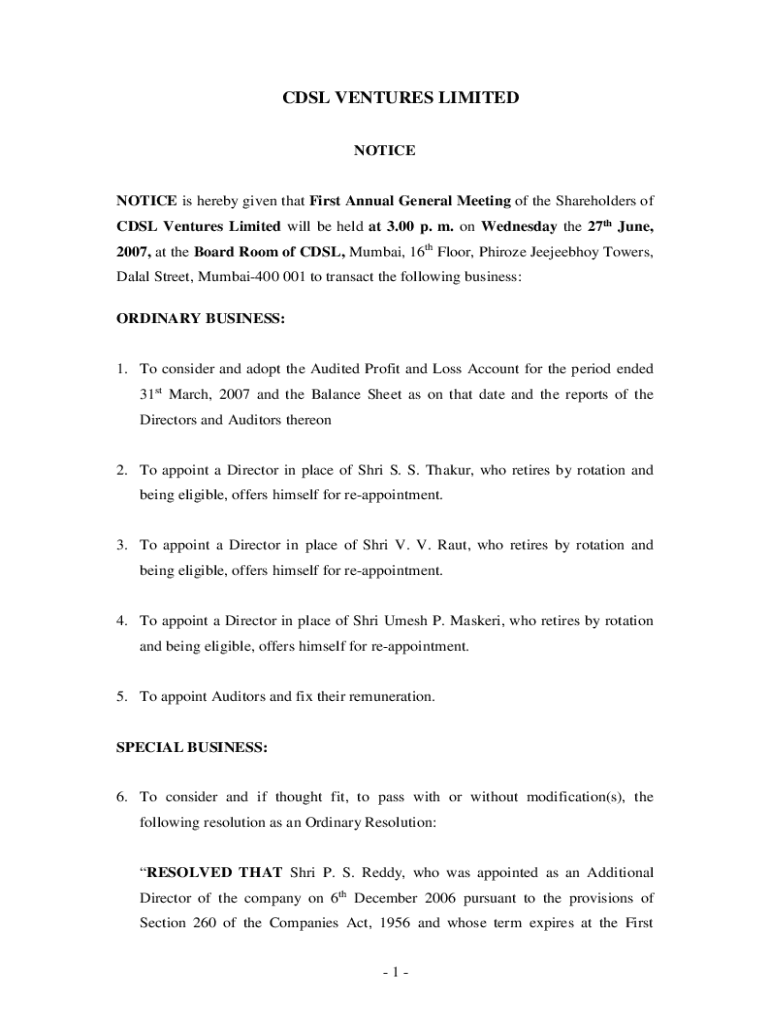 Get the free Notice of 1st AGM.pdf - CDSL Ventures Limited