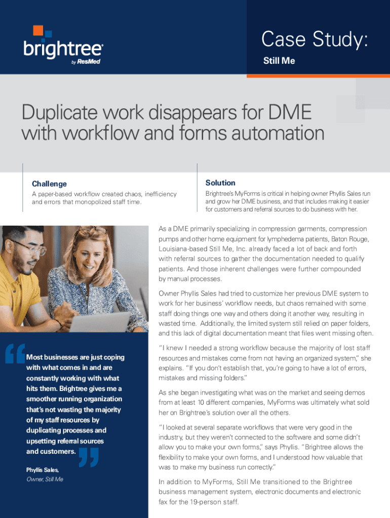 Case Study: Still Reduplicate work disappears for DME with workflow and forms automation ChallengeSolutionA paper based workflow created chaos, inefficiency and errors that monopolized staff time.