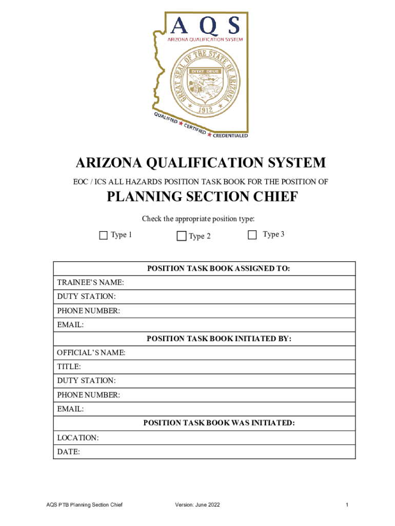 ARIZONA QUALIFICATION SYSTEM EOC / ICS ALL HAZARDS POSITION TASK BOOK FOR THE POSITION PLANNING SECTION CHIEF Check the appropriate position type: Type 1Type 2Type 3POSITION TASK BOOK ASSIGNED TO: