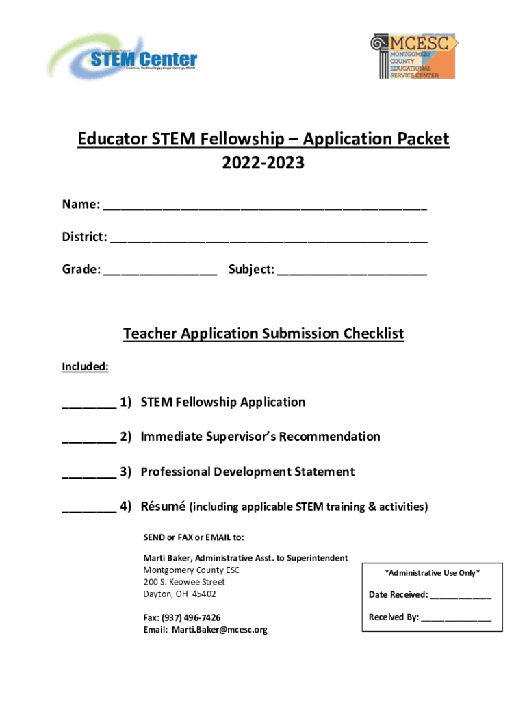 Educator STEM Fellowship Application Packet 20222023 Name: ___ District: ___ Grade: ___ Subject: ___Teacher Application Submission Checklist Included:___ 1) STEM Fellowship Application ___ 2) Immediate