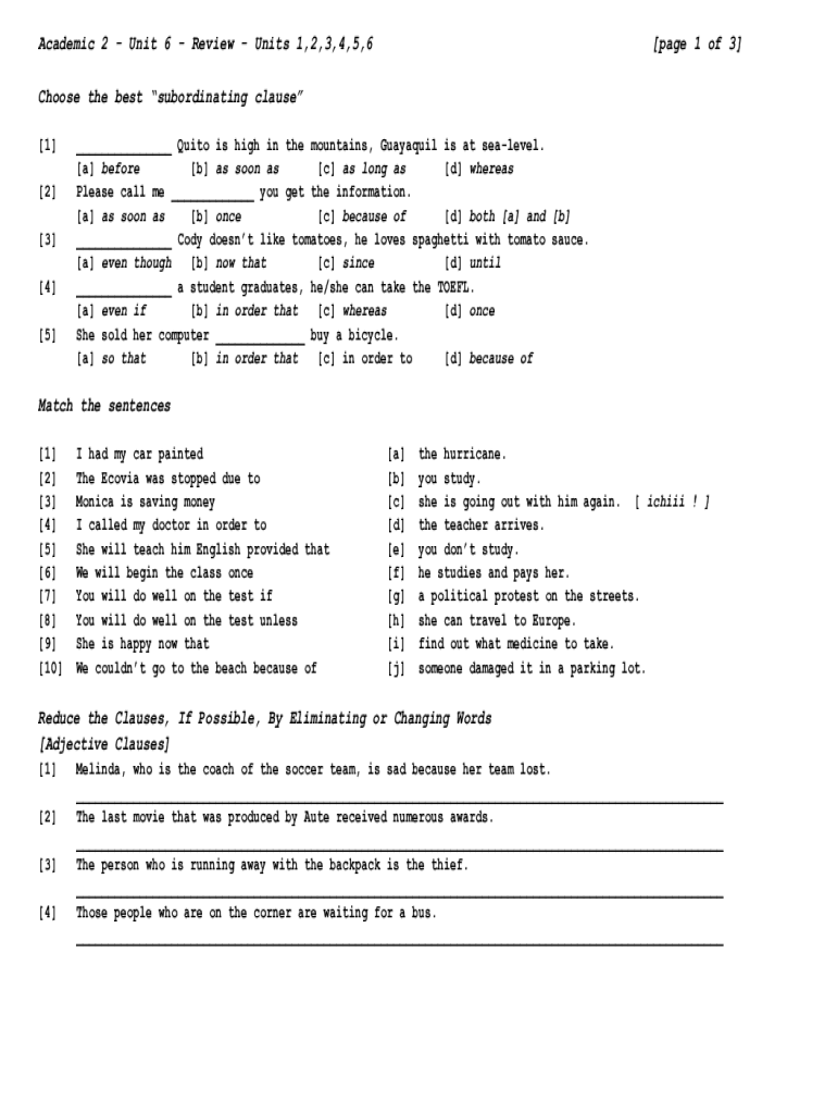 Academic 2 Unit 6 Review Units 1,2,3,4,5,6[page 1 of 3]Choose the best subordinating clause [1] [2] [3] [4] [5]___ Quito is high in the mountains, Guayaquil is at sea level. [a] before [b] as soon