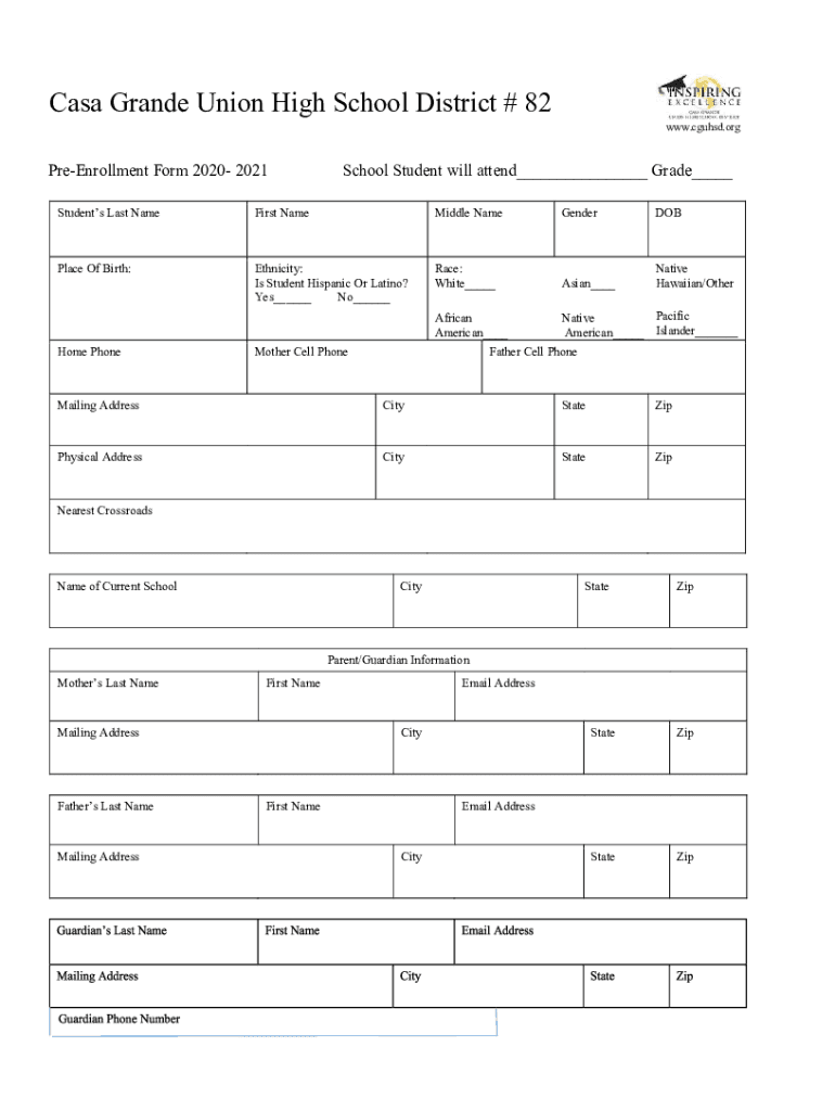 Casa Grande Union High School District # 82 www.cguhsd.orgPreEnrollment Form 2020 2021School Student will attend___ Grade___Students Last NameFirst NameMiddle NameGenderDOBPlace Of Birth:Ethnicity: