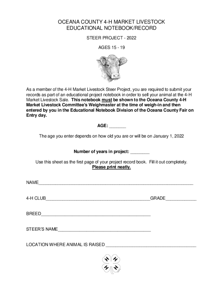 OCEANA COUNTY 4H MARKET LIVESTOCK EDUCATIONAL NOTEBOOK/RECORD STEER PROJECT 2022 AGES 15 19As a member of the 4H Market Livestock Steer Project, you are required to submit your records as part of