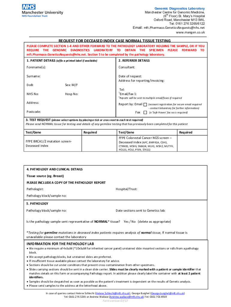 Genomic Diagnostics Laboratory Manchester Center for Genomic Medicine, (6th Floor) St. Mary's Hospital Oxford Road, Manchester M13 9WL Tel: 0161 276 3265/6122Email: mft.Pharmaco.GeneticsRequests@nhs.net
