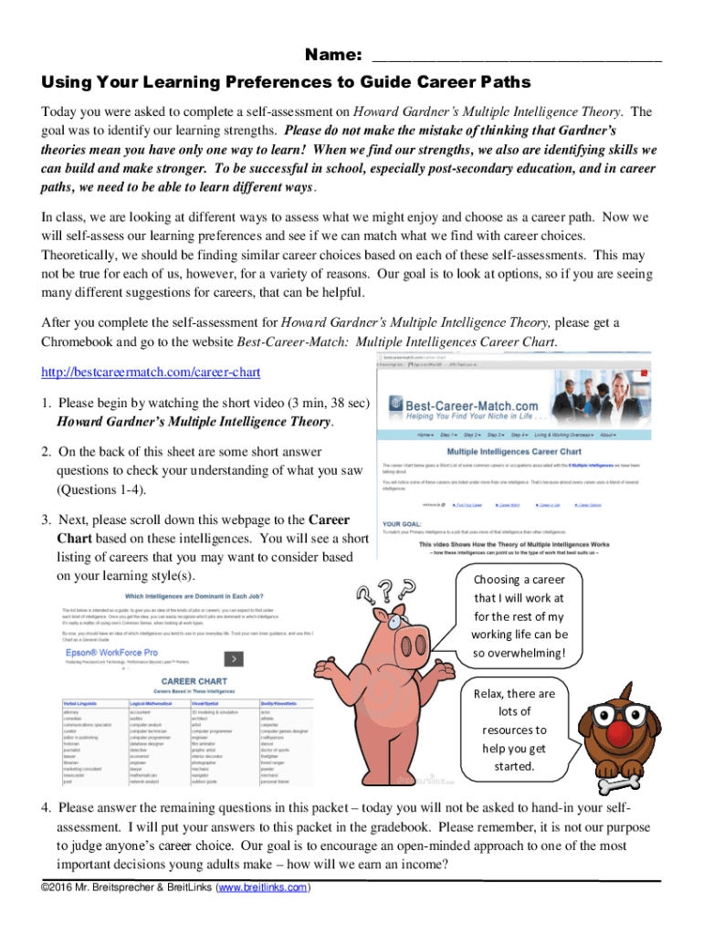 Name: ___ Using Your Learning Preferences to Guide Career Paths Today you were asked to complete a self assessment on Howard Gardner's Multiple Intelligence Theory. The goal was to identify our learning