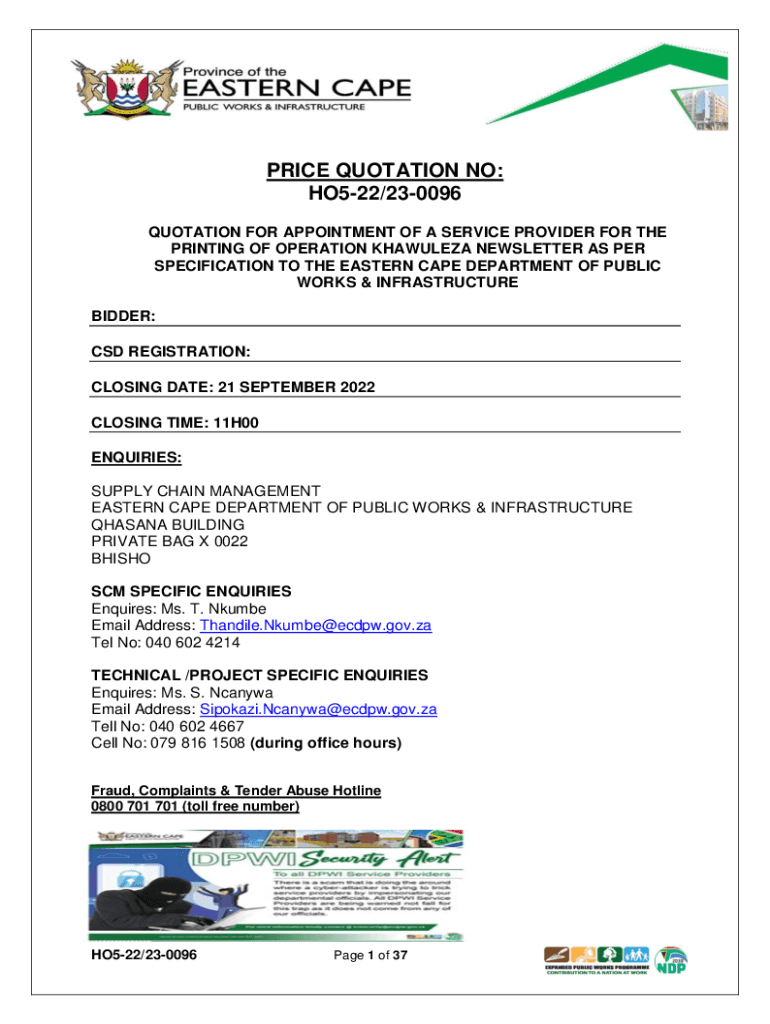 Get the free PRICE QUOTATION NO: HO5-22/23-0096