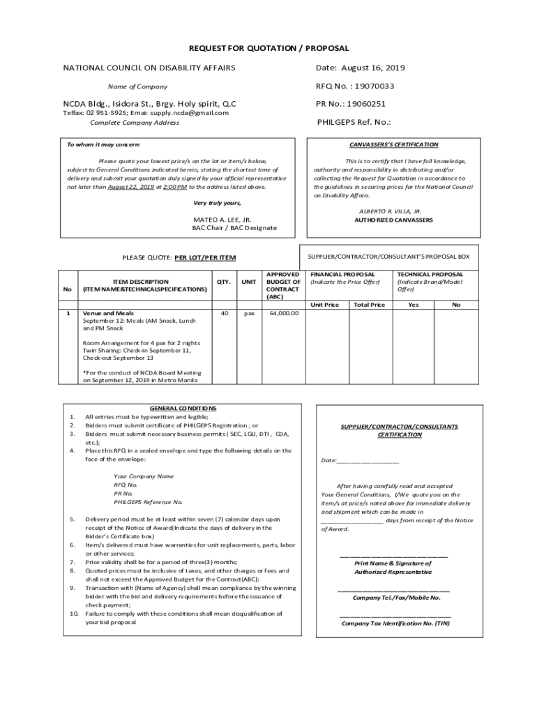 RFQ No. 19070033Name of CompanyNCDA Bldg., Isidora St., Bray. Holy Spirit, Q.CPR No.: 19060251Telfax: