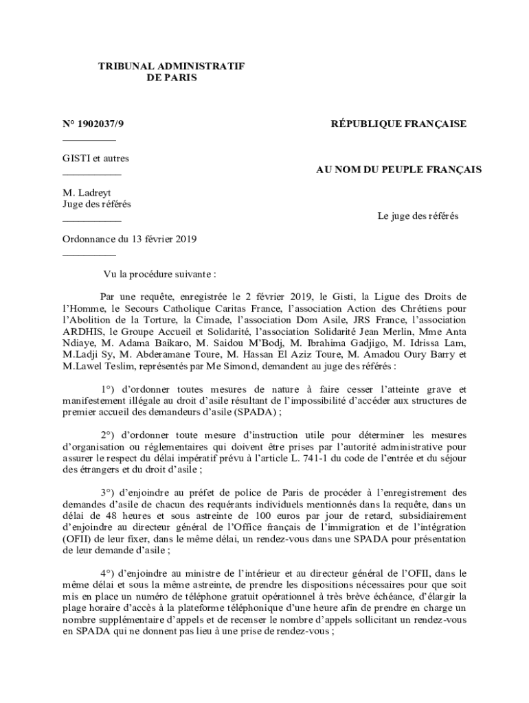 TRIBUNAL ADMINISTRATION DE PARIS 1902037/9 ___ GIST ET actress ___ M. Laura June DES FRS ___OBLIQUE FRANCISCAN NOT DU PEOPLE Frangible June DES rfrsOrdonnance Du 13 frier 2019 ___ VU la procedure