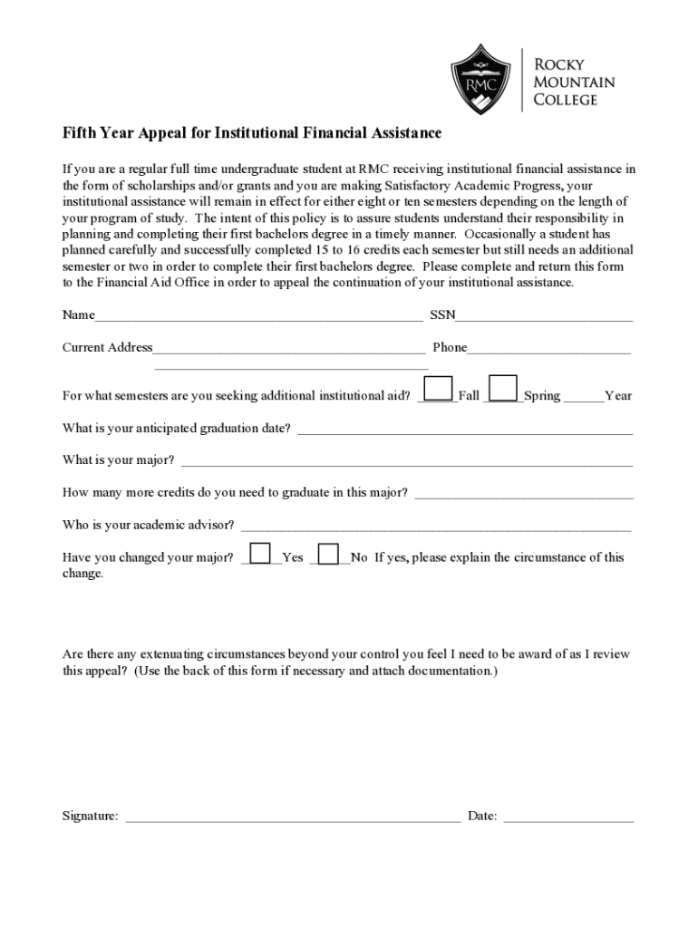 Fifth Year Appeal for Institutional Financial Assistance If you are a regular full time undergraduate student at RMC receiving institutional financial assistance in the form of scholarships and/or
