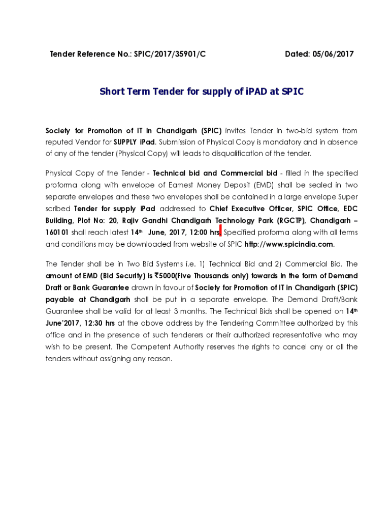 Tender Reference No.: SPIC/2017/35901/Dated: 05/06/2017Short Term Tender for supply of iPad at SPICSociety for Promotion of IT in Chandigarh (SPIC) invites Tender in two bid system from reputed Vendor