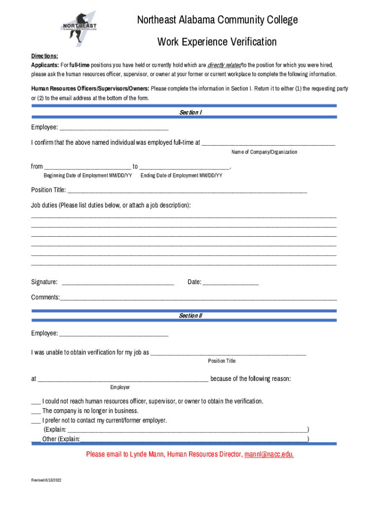 Northeast Alabama Community College Work Experience Verification Directions: Applicants: For full time positions you have held or currently hold which are directly related to the position for which