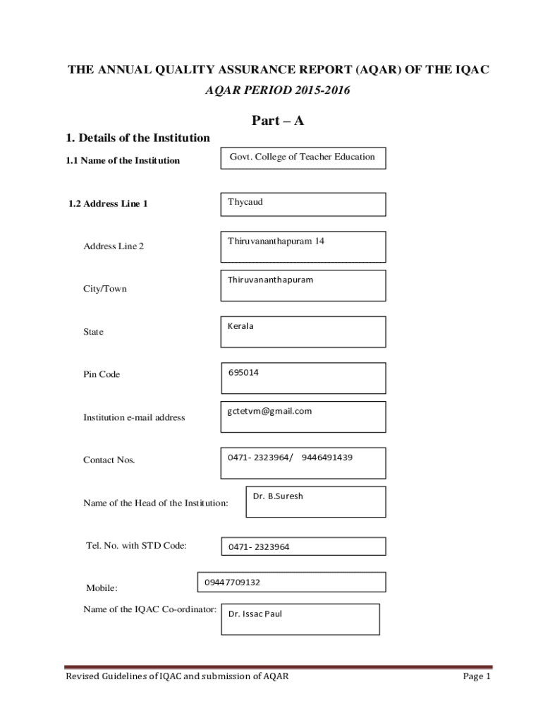 1.1 Name of the InstitutionGovt. College of Teacher Education1.2 Address Line 1ThycaudThiruvananthapuram