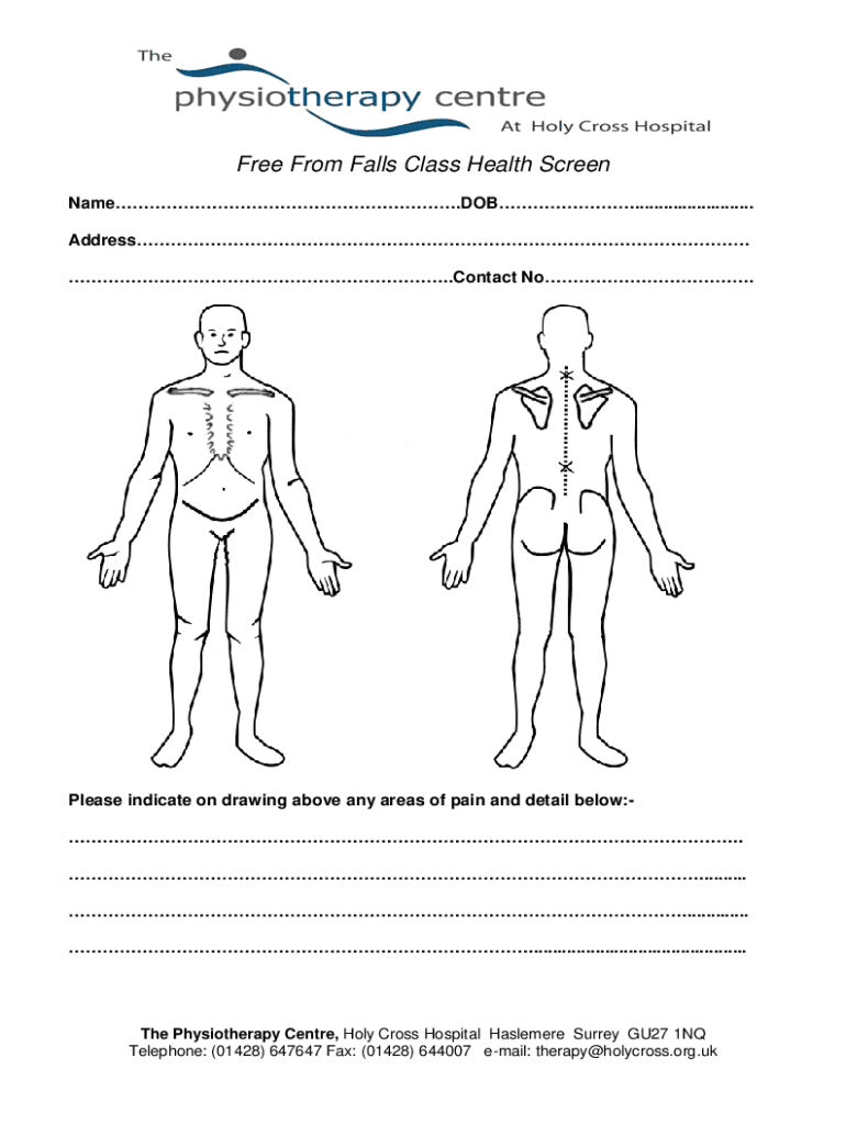 Free From Falls Class Health Screen Name.DOB......................... Address. Contact No. Please indicate on drawing above any areas of pain and detail below: