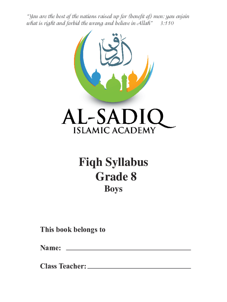 You are the best of the nations raised up for (benefit of) men: you enjoin what is right and forbid the wrong and believe in Allah3:110Fiqh Syllabus Grade 8 Boasts book belongs to Name: Class Teacher:FIQH
