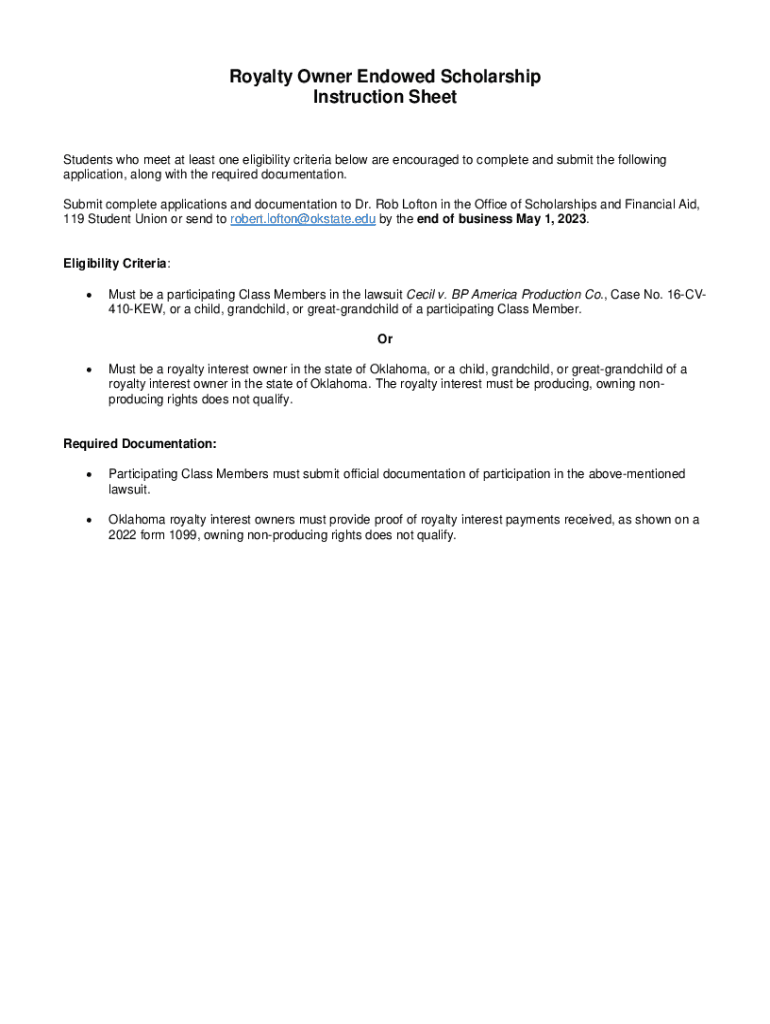 Royalty Owner Endowed Scholarship Instruction SheetStudents who meet at least one eligibility criteria below are encouraged to complete and submit the following application, along with the required