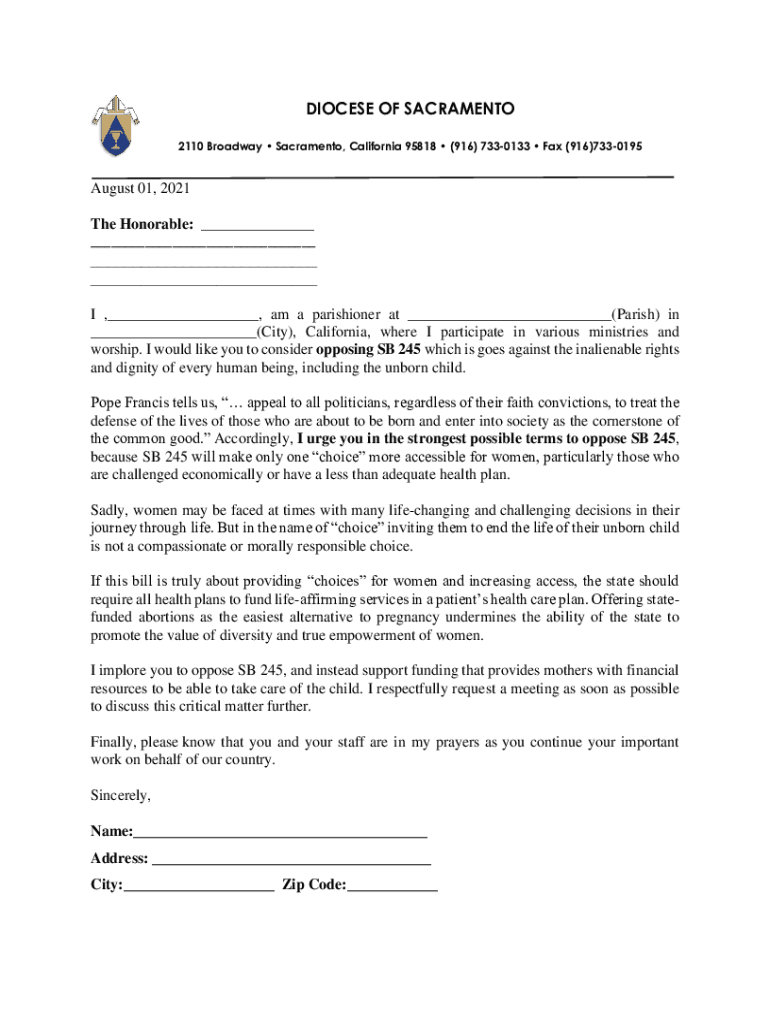 Get the free SB 245 Sample Letter.pdf - Diocese of Sacramento