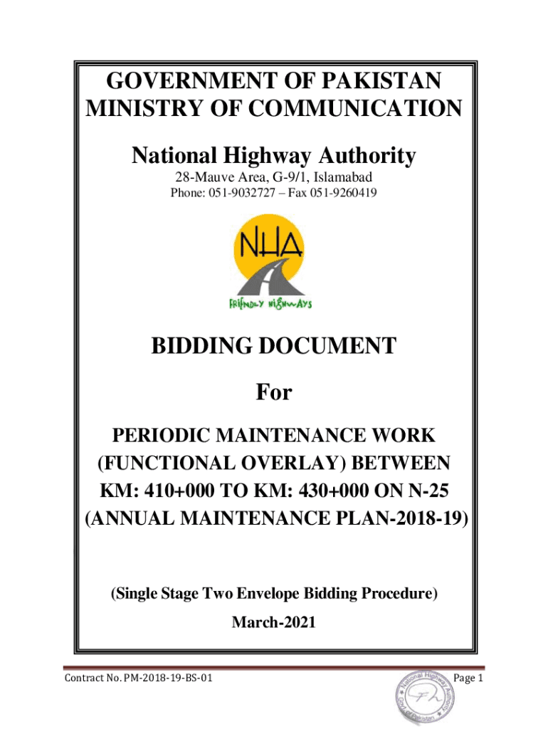 GOVERNMENT OF PAKISTAN MINISTRY OF COMMUNICATION National Highway Authority 28Mauve Area, G9/1, Islamabad Phone: 0519032727 Fax 0519260419BIDDING DOCUMENT For PERIODIC MAINTENANCE WORK (FUNCTIONAL