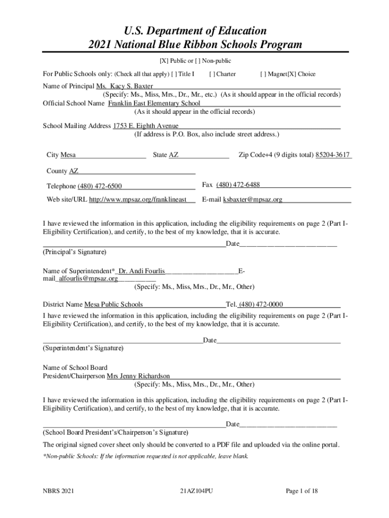 U.S. Department of Education 2021 National Blue Ribbon Schools Program [X] Public or [ ] Nonpublic Public Schools only: (Check all that apply) [ ] Title I[ ] Charter[ ] Magnet[X] ChoiceName of Principal