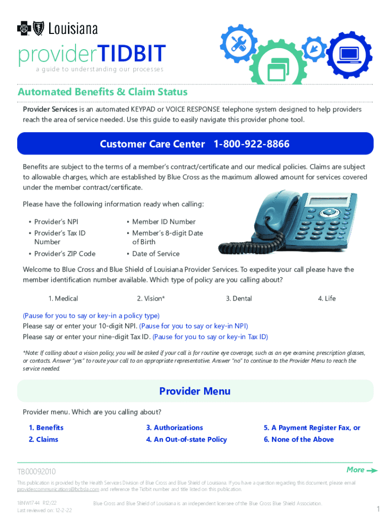 ProviderTIDBIT a guide to understanding our processesAutomated Benefits & Claim Status Provider Services is an automated KEYPAD or VOICE RESPONSE telephone system designed to help providers reach