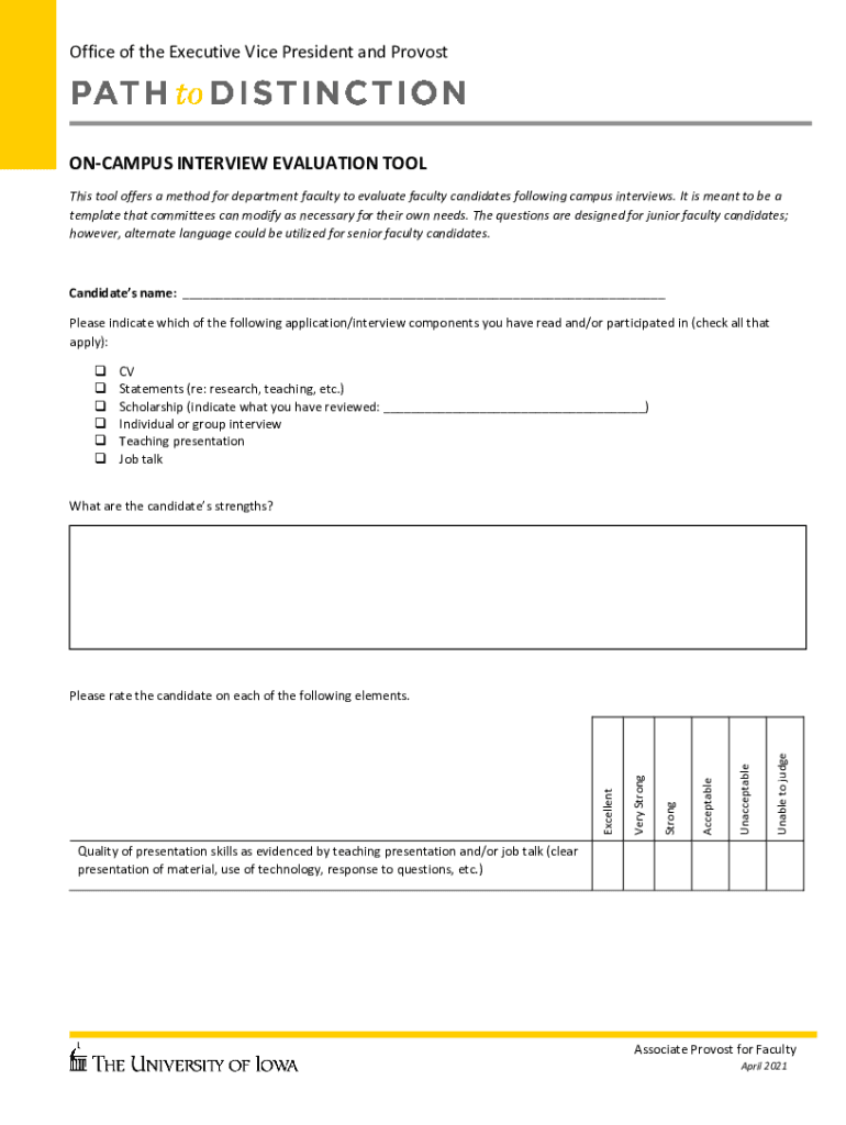 Office of the Executive Vice President and ProvostONCAMPUS INTERVIEW EVALUATION TOOL This tool offers a method for department faculty to evaluate faculty candidates following campus interviews. It