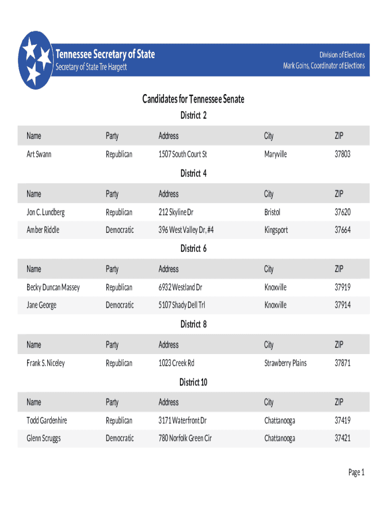 Candidates for Tennessee Senate Jurisdiction District 2 NamePartyAddressCityZIPArt SwannRepublican1507 South Court StMaryville37803Jurisdictio District 4 NamePartyAddressCityZIPJon C. LundbergRepublican212