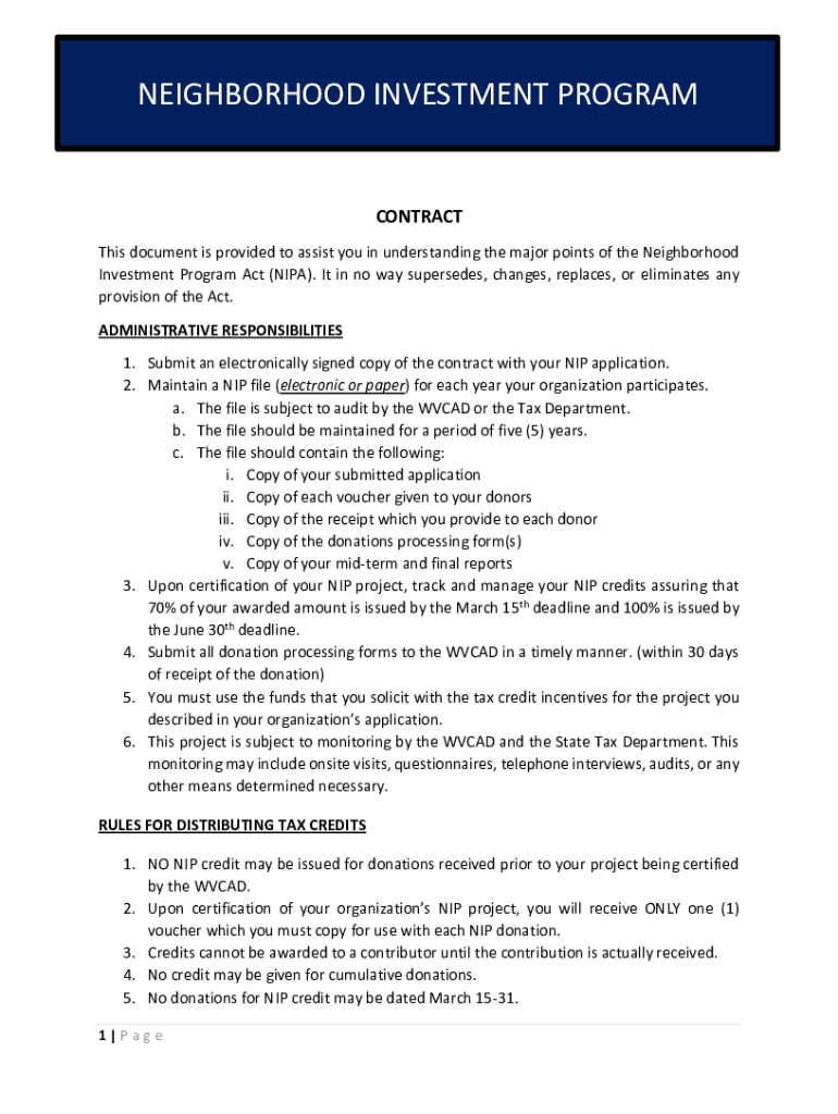 NEIGHBORHOOD INVESTMENT PROGRAMCONTRACT This document is provided to assist you in understanding the major points of the Neighborhood Investment Program Act (IPA). It in no way supersedes, changes,