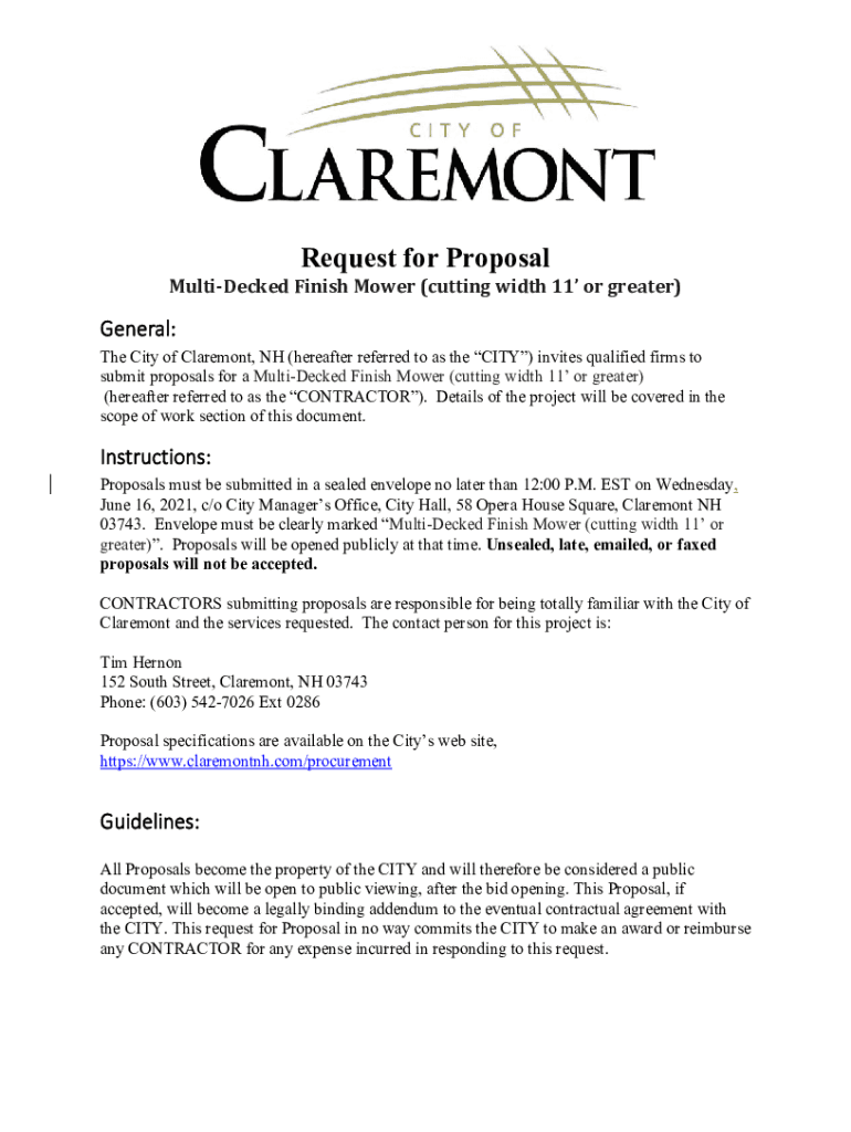 Request for ProposalMultiDecked Finish Mower (cutting width 11 or greater)General: The City of Claremont, NH (hereafter referred to as the CITY) invites qualified firms to submit proposals for a Multicelled