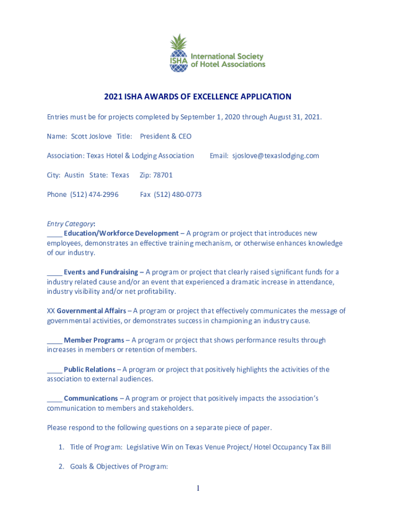 2021 OSHA AWARDS OF EXCELLENCE APPLICATION Entries must be for projects completed by September 1, 2020, through August 31, 2021. Name: Scott Love Title: President & CEO Association: Texas Hotel &