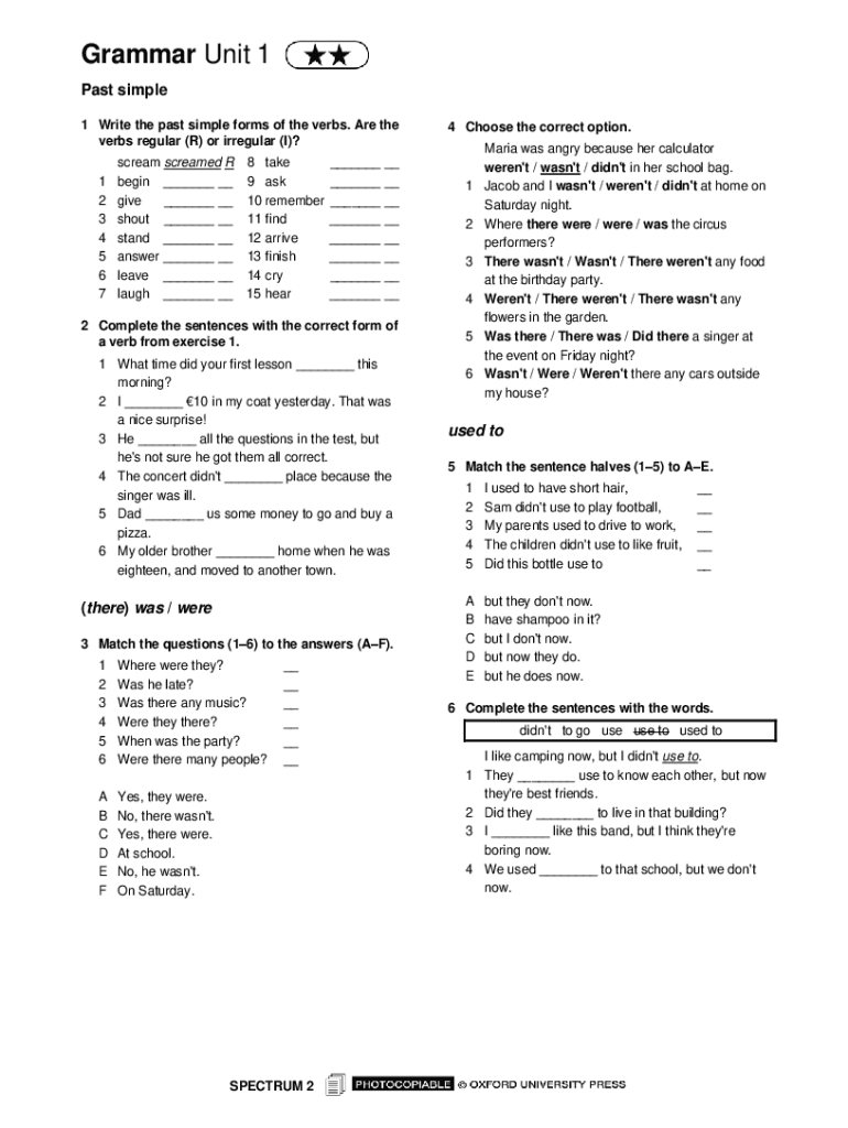 Grammar Unit 1 Past simple 1 Write the past simple forms of the verbs. Are the verbs regular (R) or irregular (I)? 1 2 3 4 5 6 7scream screamed R begin ___ __ give ___ __ shout ___ __ stand ___ __