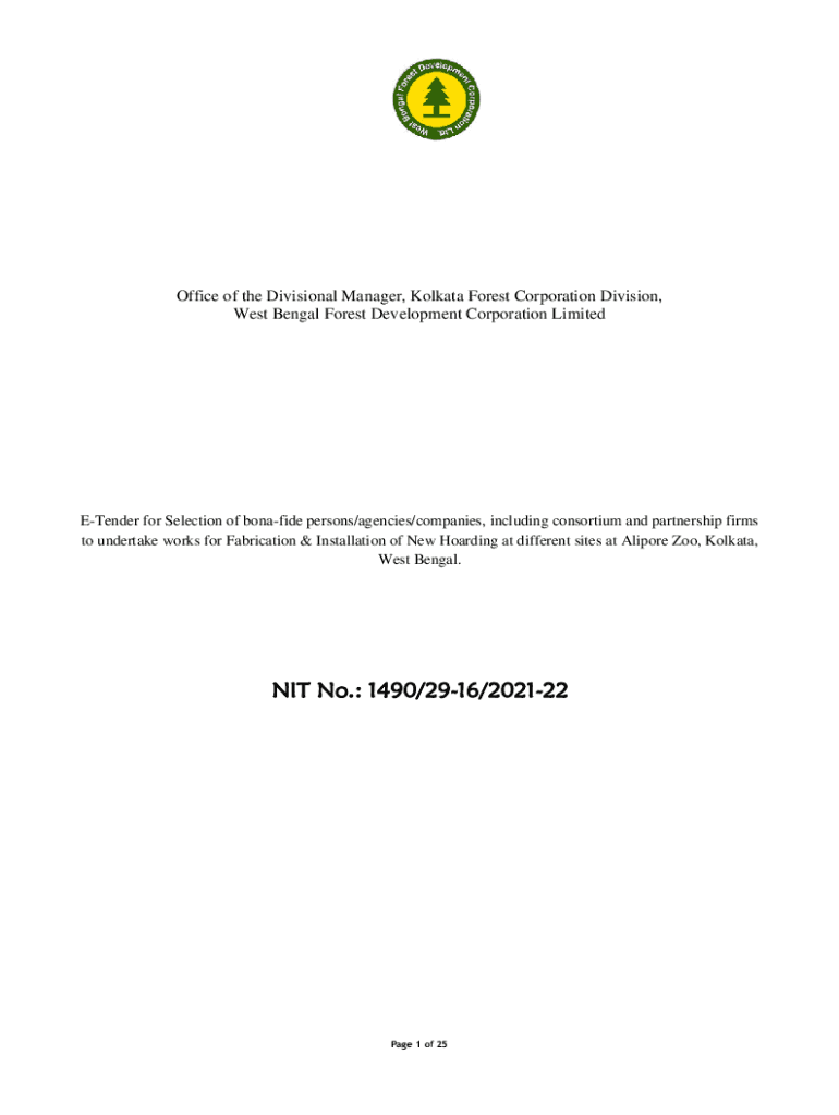 Office of the Divisional Manager, Kolkata Forest Corporation Division, West Bengal Forest Development Corporation LimitedETender for Selection of bona fide persons/agencies/companies, including consortium