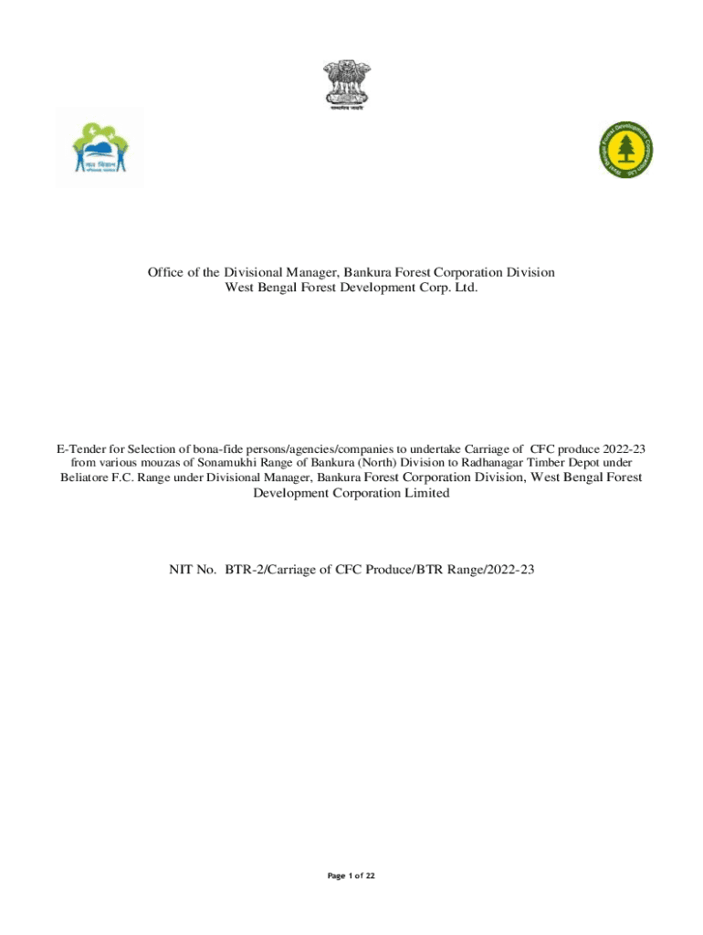 Office of the Divisional Manager, Bandura Forest Corporation Division West Bengal Forest Development Corp. Ltd. Tender for Selection of bona fide persons/agencies/companies to undertake Carriage of