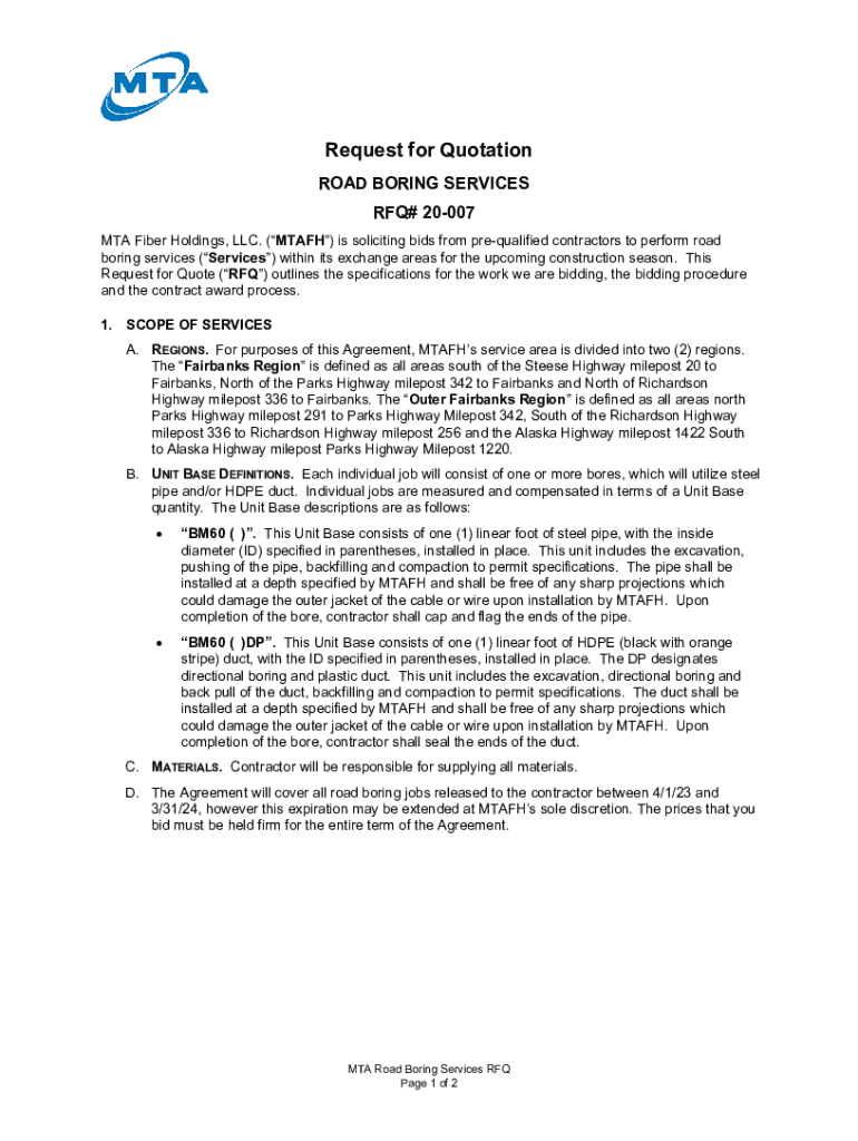Request for Quotation ROAD BORING SERVICES RFQ# 20007 MTA Fiber Holdings, LLC. (MT AFH) is soliciting bids from prequalified contractors to perform road boring services (Services) within its exchange