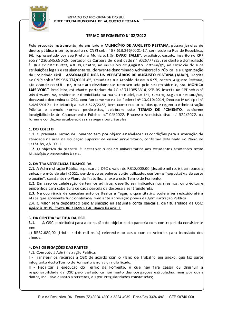 ESTATE DO RIO GRANDE DO SUL PREFECTURE MUNICIPAL DE AUGUSTO PESTANATERMO DE FOMENT N 02/2022 Polo present instrument, DE um Lady o MUNICIPAL DE AUGUSTO ASTANA, person juridical DE direct public intern,