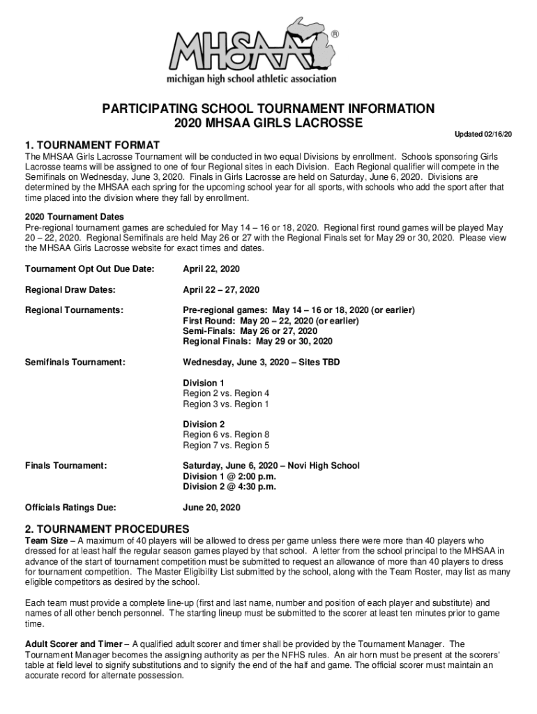 PARTICIPATING SCHOOL TOURNAMENT INFORMATION 2020 MH SAA GIRLS LACROSSE Updated 02/16/201. TOURNAMENT FORMAT The MH SAA Girls Lacrosse Tournament will be conducted in two equal Divisions by enrollment.