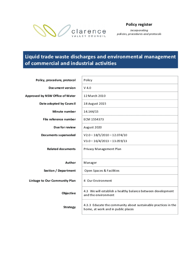 Policy register incorporating policies, procedures and protocolsLiquid trade waste discharges and environmental management of commercial and industrial activities Policy, procedure, protocol Document