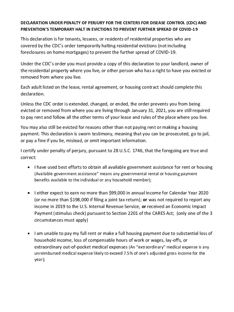 DECLARATION UNDER PENALTY OF PERJURY FOR THE CENTERS FOR DISEASE CONTROL (CDC) AND PREVENTIONS TEMPORARY HALT IN EVICTIONS TO PREVENT FURTHER SPREAD OF COVID19This declaration is for tenants, lessees,