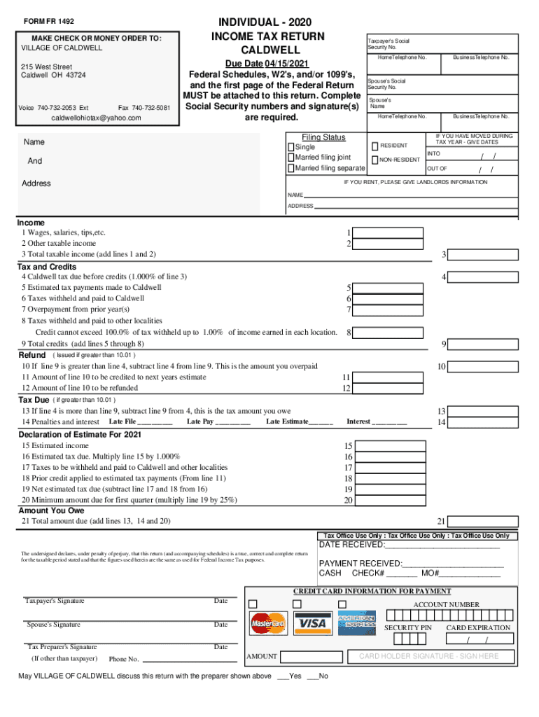 FORM FR 1492 MAKE CHECK OR MONEY ORDER TO: VILLAGE OF CALDWELL 215 West Street Caldwell OH 43724Voice 7407322053 Extra 7407325081caldwellohiotax@yahoo.comINDIVIDUAL 2020 INCOME TAX RETURN CALDWELLTaxpayer\'s