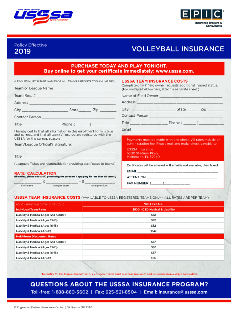 Policy EffectiveVOLLEYBALL INSURANCE2019PURCHASE TODAY AND PLAY TONIGHT. Buy online to get your certificate immediately: www.usssa.com. (LEAGUES MUST SUBMIT NAMES OF ALL TEAMS & REGISTRATION NUMBERS)US