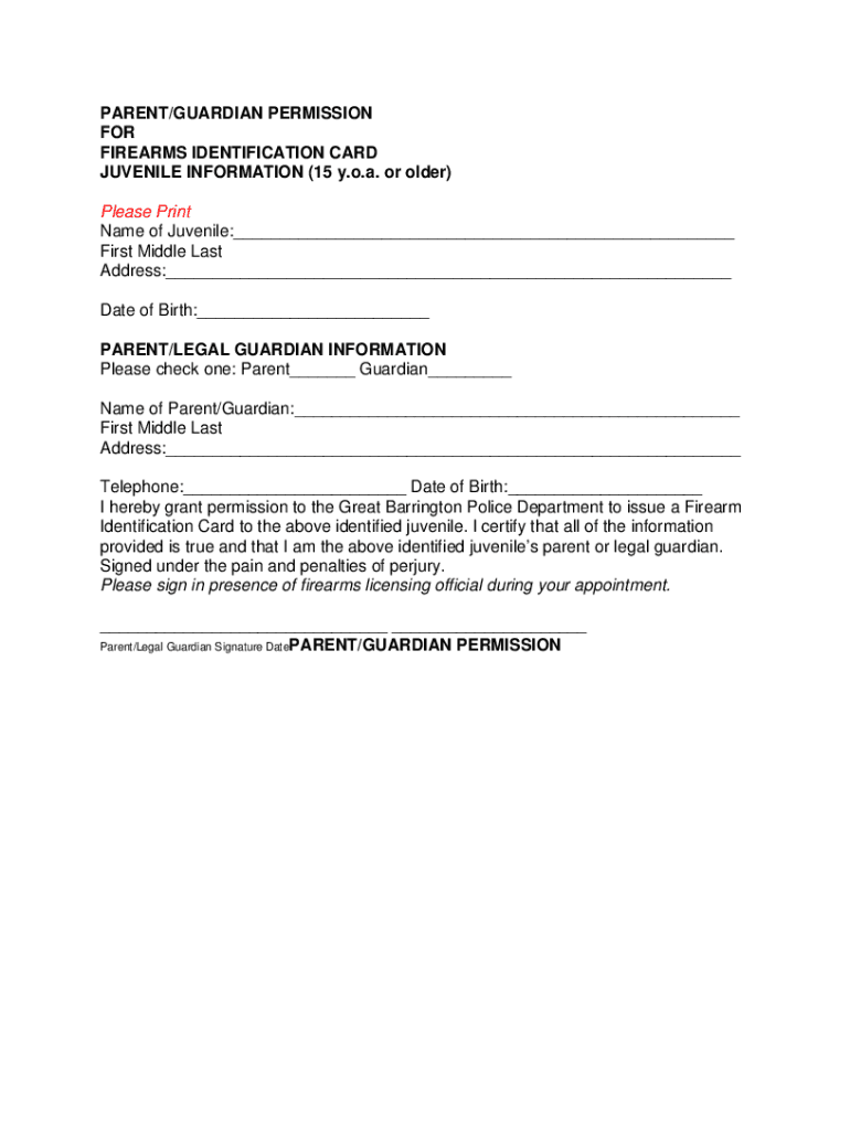 PARENT/GUARDIAN PERMISSION FOR FIREARMS IDENTIFICATION CARD JUVENILE INFORMATION (15 y.o.a. or older) Please Print Name of Juvenile:___ First Middle Last Address:___ Date of Birth:___ PARENT/LEGAL