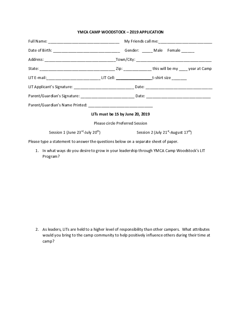 The YMCA Camp Woodstock2019 application is a form that needs to be filled out by individuals who wish to attend the camp in 2019.