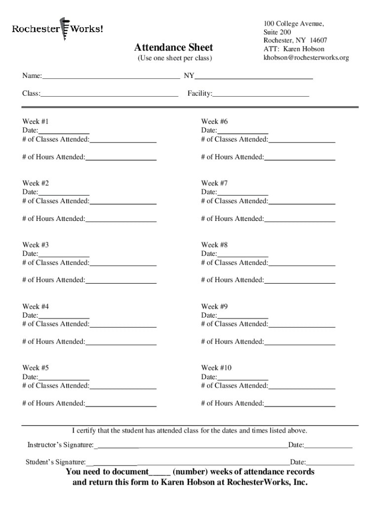 Attendance Sheet (Use one sheet per class) Name:___ NY Class:___100 College Avenue, Suite 200 Rochester, NY 14607 ATT: Karen Hobson khobson@rochesterworks.org ATT: Karen HobsonFacility:___Week #1