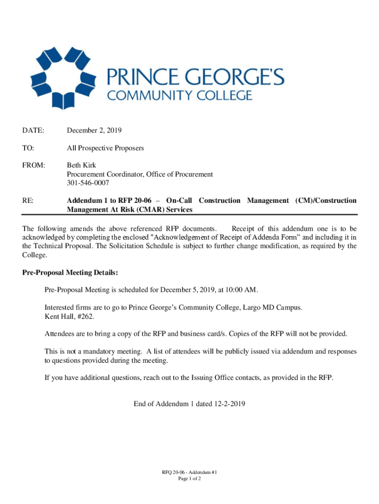 DATE:December 2, 2019TO:All Prospective ProposersFROM:Beth Kirk Procurement Coordinator, Office of Procurement 3015460007RE:Addendum 1 to RFP 2006 Call Construction Management (CM)/Construction Management