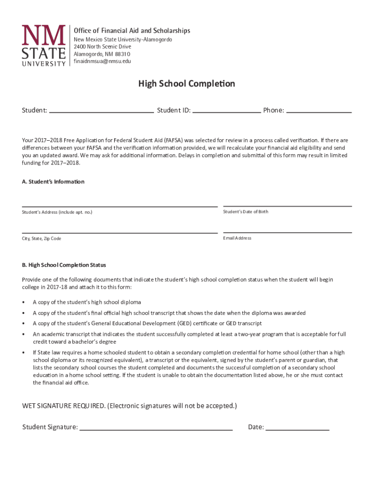 Office of Financial Aid and Scholarships New Mexico State University Alamogordo 2400 North Scenic Drive Alamogordo, NM 88310 finaidnmsua@nmsu.eduHigh School Completion Student:Student ID:Phone:Your