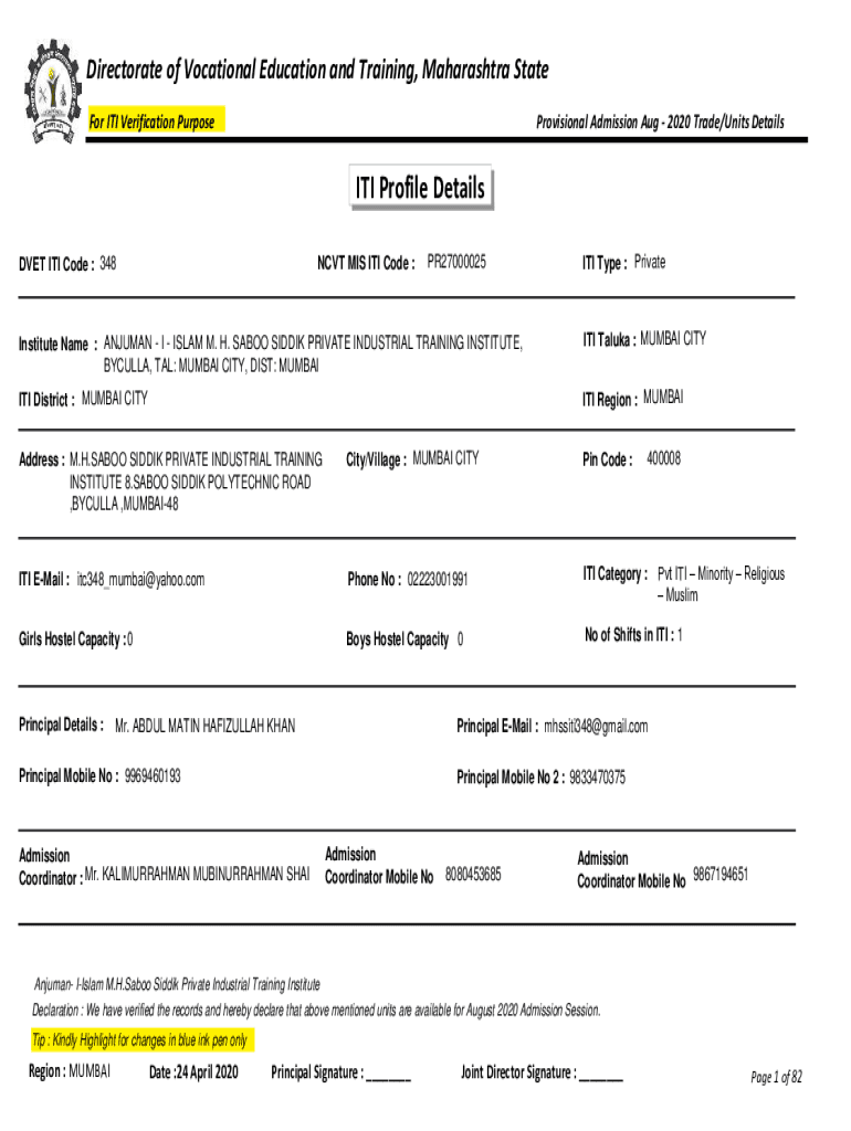 For IT Verification PurposeProvisional Admission Aug 2020 Trade/Units Details Profile Details