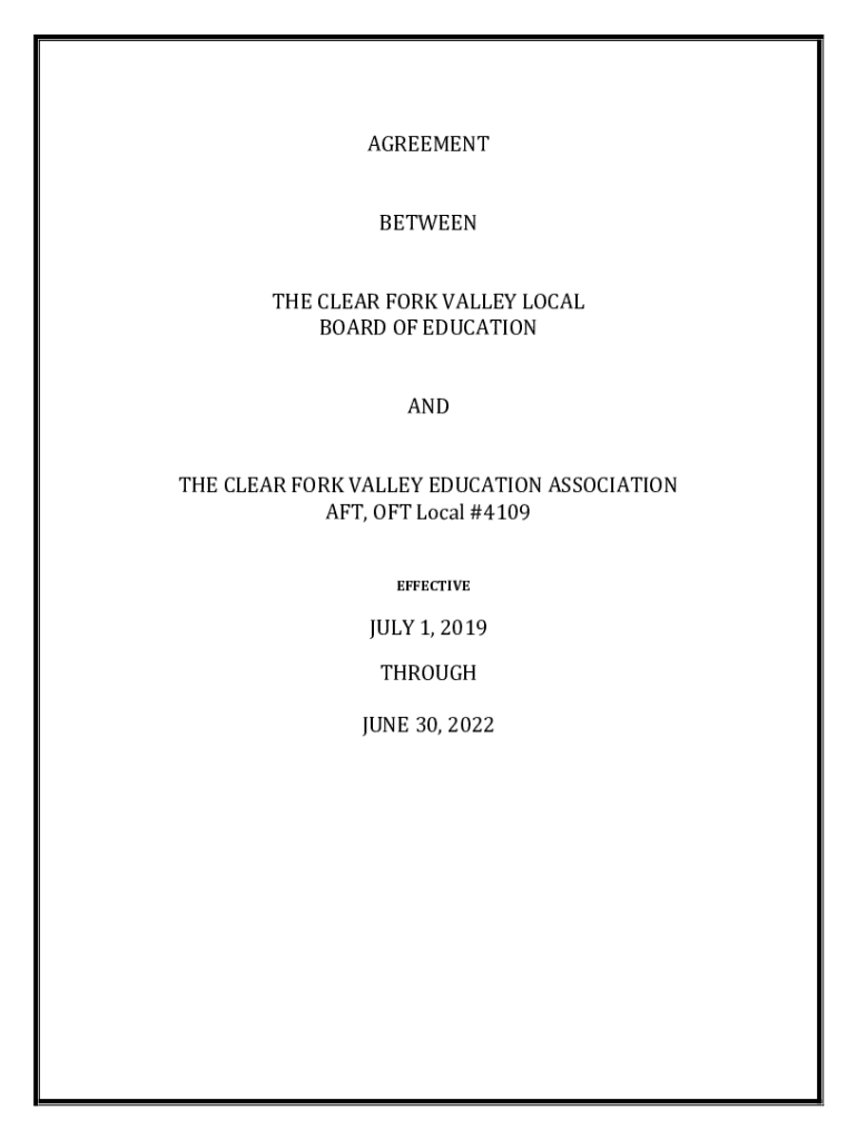 AGREEMENT BETWEEN THE CLEAR FORK VALLEY LOCAL BOARD OF EDUCATION AND THE CLEAR FORK VALLEY EDUCATION ASSOCIATION AFT, OFT Local #4109 EFFECTIVELY 1, 2019 THROUGH JUNE 30, 2022TABLE OF CONTENTS Page