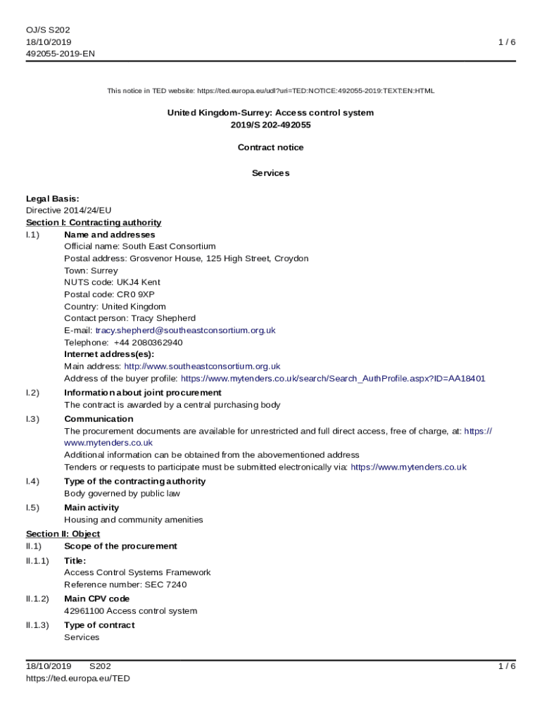 OJ/S S202 18/10/2019 4920552019EN1/6This notice in TED website: https://ted.europa.eu/udl?uriTED:NOTICE:4920552019:TEXT:EN:HTMLUnited KingdomSurrey: Access control system 2019/S 202492055 Contract