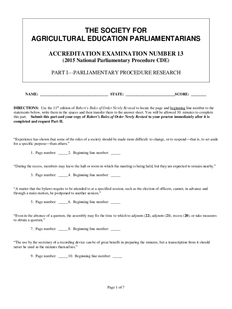 THE SOCIETY FOR AGRICULTURAL EDUCATION PARLIAMENTARIANS ACCREDITATION EXAMINATION NUMBER 13 (2015 National Parliamentary Procedure CDE) PART PARLIAMENTARY PROCEDURE ResearchGate: ___ STATE: ___SCORE: