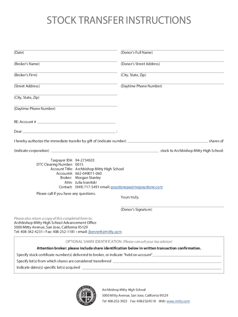STOCKTRANSFERINSTRUCTIONS (Date)(Donors Full Name)(Brokers Name)(Donors Street Address)(Brokers Firm)(City, State, Zip)(Street Address)(Daytime Phone Number)(City, State, Zip) (Daytime Phone Number)