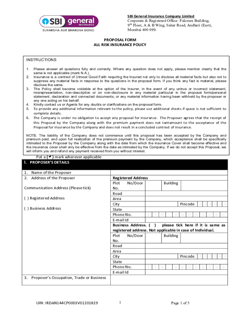SBI General Insurance Company Limited Corporate & Registered Office: Fulcrum Building, 9th Floor, A & B Wing, Sahara Road, Adhere (East), Mumbai 400 099.PROPOSAL FORM ALL RISK INSURANCE POLICYINSTRUCTIONS